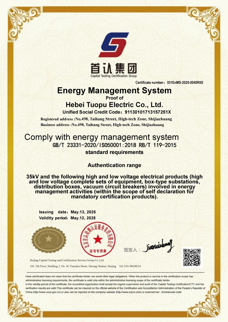 近日,我司—— 河北拓普電氣股份有限公司憑借完善的能源管理體系建設(shè)、卓越的能源管控能力以及全員參與的節(jié)能降耗實(shí)踐,順利通過北京首認(rèn)檢測(cè)認(rèn)證服務(wù)集團(tuán)有限公司的嚴(yán)格審核,正式獲得能源管理體系認(rèn)證證書!這一認(rèn)證的取得,標(biāo)志著我司在能源管理標(biāo)準(zhǔn)化、規(guī)范化、系統(tǒng)化建設(shè)方面邁出了堅(jiān)實(shí)一步,更是我司踐行綠色發(fā)展理念、推動(dòng)可持續(xù)發(fā)展的重要里程碑!