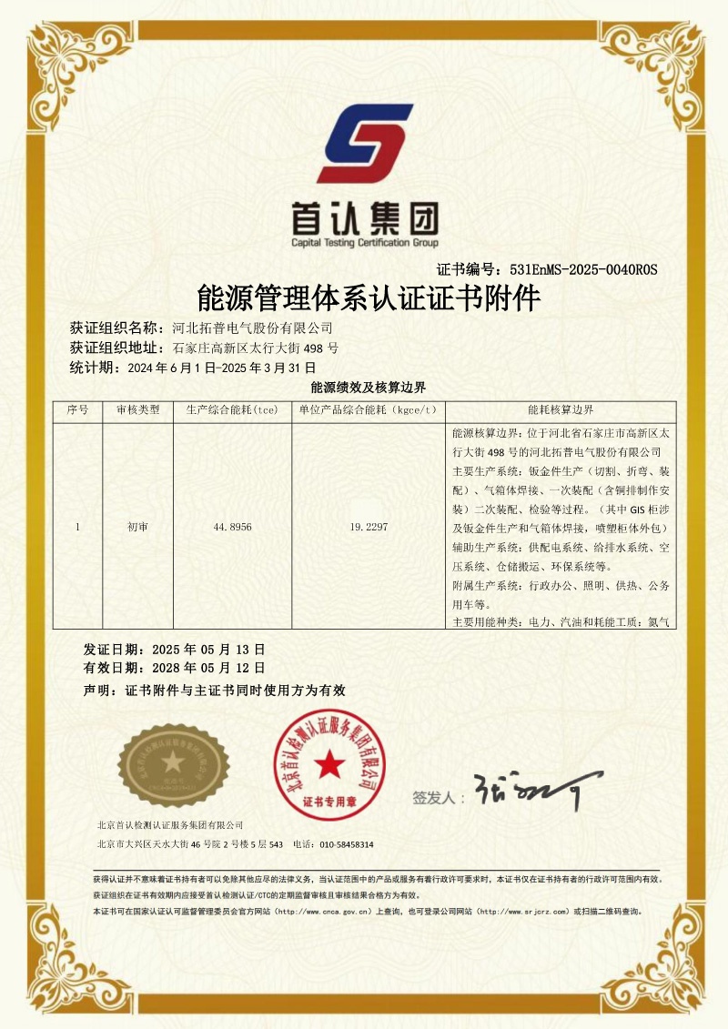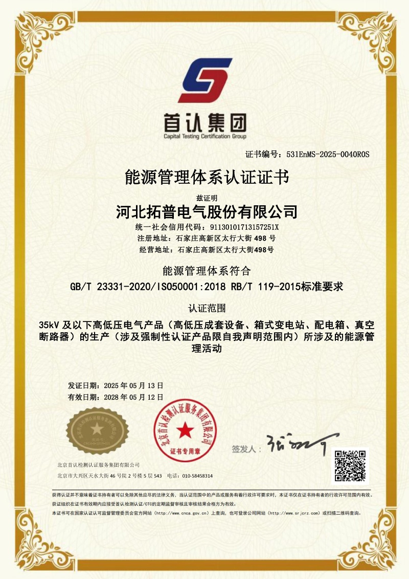 近日,我司—— 河北拓普電氣股份有限公司憑借完善的能源管理體系建設(shè)、卓越的能源管控能力以及全員參與的節(jié)能降耗實(shí)踐,順利通過北京首認(rèn)檢測(cè)認(rèn)證服務(wù)集團(tuán)有限公司的嚴(yán)格審核,正式獲得能源管理體系認(rèn)證證書!這一認(rèn)證的取得,標(biāo)志著我司在能源管理標(biāo)準(zhǔn)化、規(guī)范化、系統(tǒng)化建設(shè)方面邁出了堅(jiān)實(shí)一步,更是我司踐行綠色發(fā)展理念、推動(dòng)可持續(xù)發(fā)展的重要里程碑!